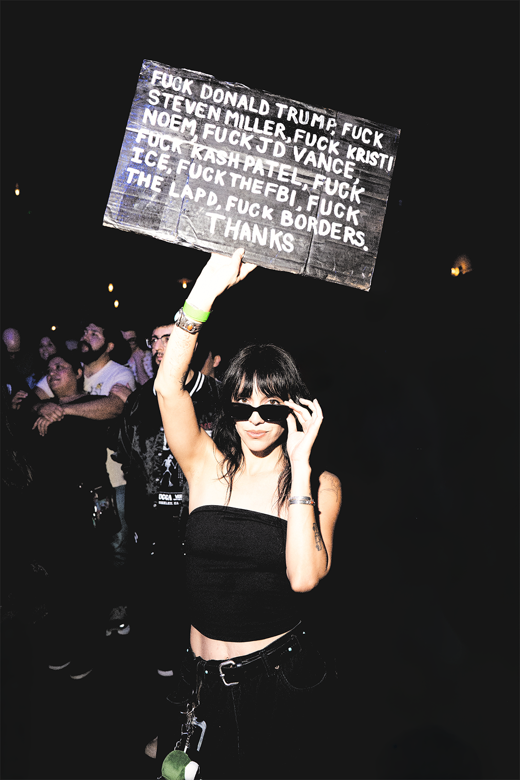 On the evening of the show, downtown was filled with protests, and that energy carried people straight into the venue. A lot of us, myself included, had come directly from the demonstrations, still dressed in black, signs folded under arms or leaned against the walls. The night did not feel like an escape from what had been happening outside. It felt like a continuation of it. The room was charged and restless, buzzing with people who needed somewhere for all that built up energy to go.