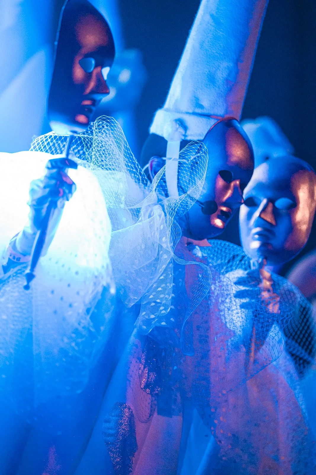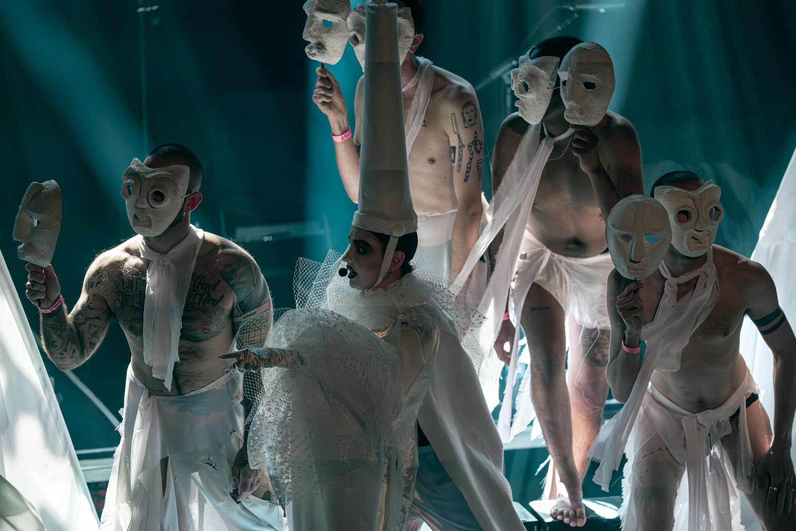 Next up was Geneva Jacuzzi, and from the moment she appeared, it felt like stepping into a dream. The stage was covered in white spikes that looked like icy mountains. Dressed in a stunning white gown and mask, she held three golden masks in one hand as her dancers, men draped in flowing white fabric, moved around her. The crowd stood transfixed, caught between curiosity and awe. Her performance was more than a concert. It was performance art in its purest form.