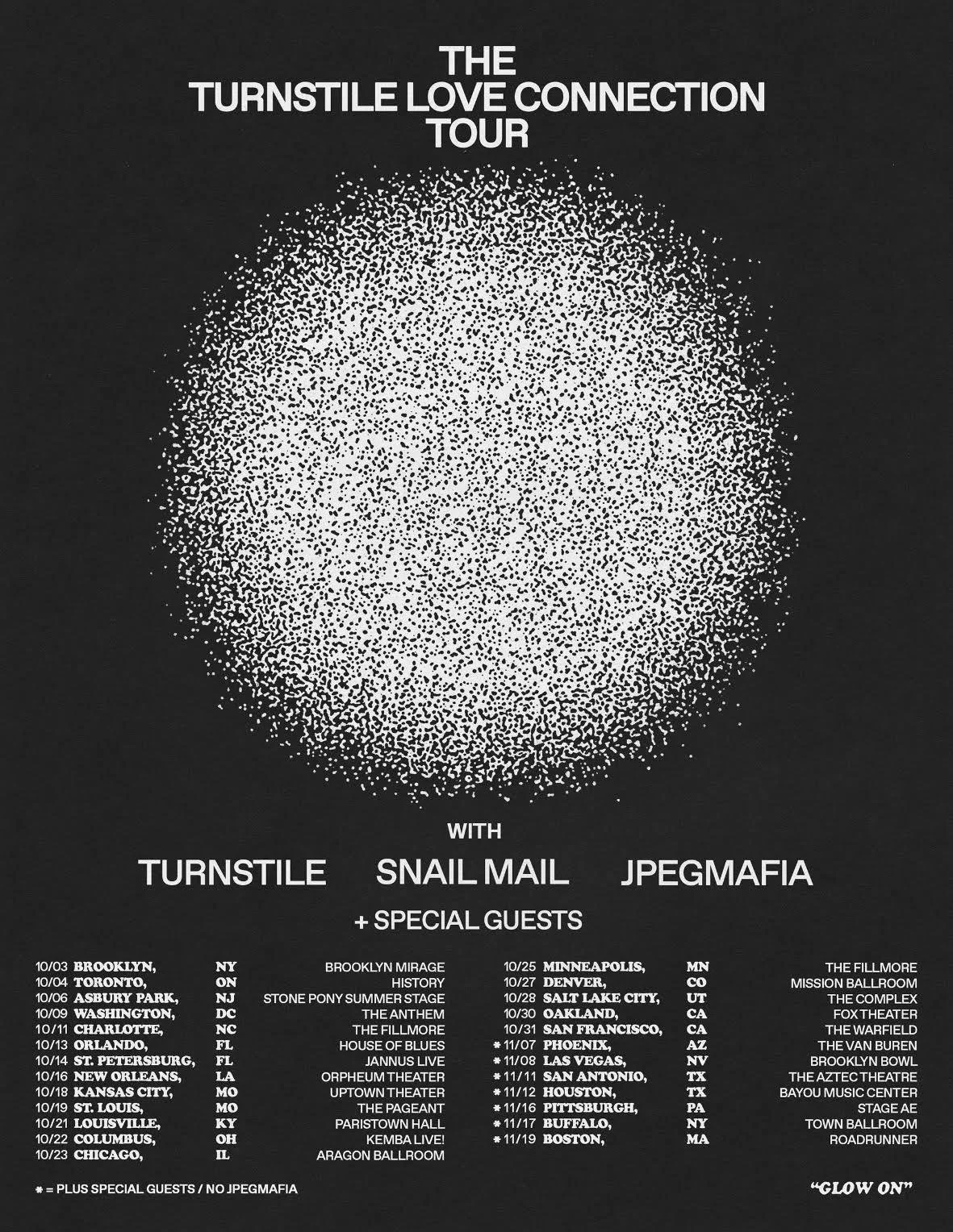 The hardcore-punk heroes in Turnstile have announced a massive fall headline tour of North America which will see the group continuing their incredibly successful “TURNSTILE LOVE CONNECTION TOUR”. Joining in will be special guests and hometown acts Snail Mail and JPEGMAFIA. The upcoming tour kicks off on October 3rd at NYC’s Brooklyn Mirage and includes stops in Asbury Park, Orlando, St. Louis, Louisville, Chicago, and more.