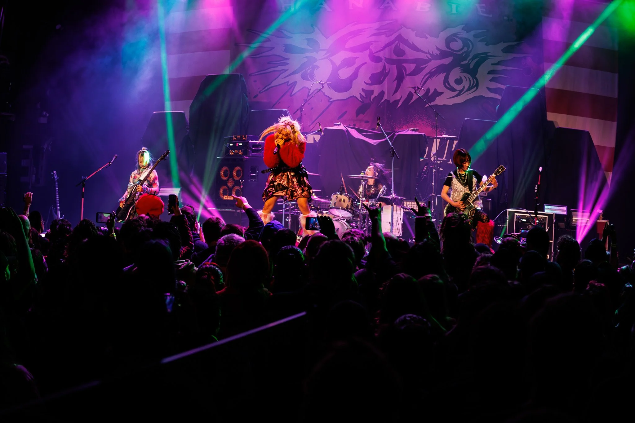 they came through Chicago last year; they surprised us. The “Feral Kitten” is not a stab at the ladies but more a compliment. They come out on stage all dressed up cute and then rip their face off with their music. Hence the “Feral Kitten,” “Oh look, it’s so cute; I want to pet it,” and boom, you're torn to shreds. Hanabie. hit the stage tonight in the usual fashion, dressed to impress, then the first riffs of “O TA KU Lovely Densetsu,” and the crowd erupted. Lead singer Yukina controlled the stage with her demonic lows and screams. You can say this tiny package is full of surprises. Add guitarist Matsuri’s clean vocals, and you have a recipe for a great one-two punch on the vocal side of this band. Hanabie. are mostly Japanese vocals, with some English parts. So, understanding the lyrics is hard, but with good music, sometimes the vocals will pave the way for you to have fun with this band. Hanabie. It has a great mix of electronic, metalcore, and that all-around anime feel with their music. The band had the crowd eating out of hands for this set; crowd surfers were seen all through this set. The stage presence of this band is phenomenal; even if you are not a fan, you more than likely will be after this show.